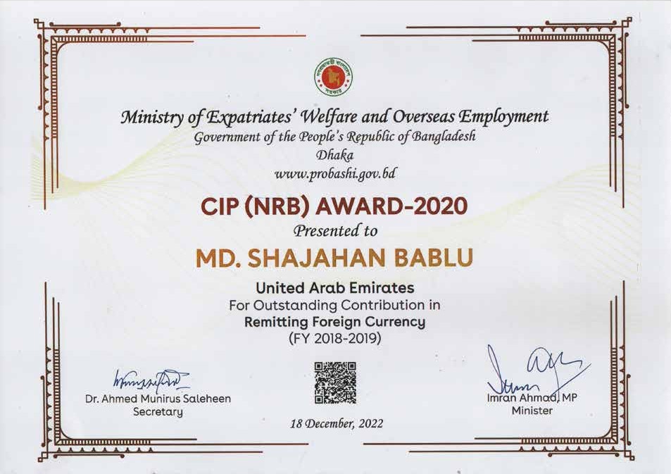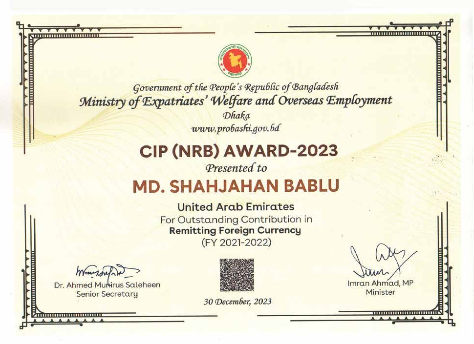 receiving “Certificate” from the Honorable Prime Minister Sheikh Hasina, Govt. of the Peoples
